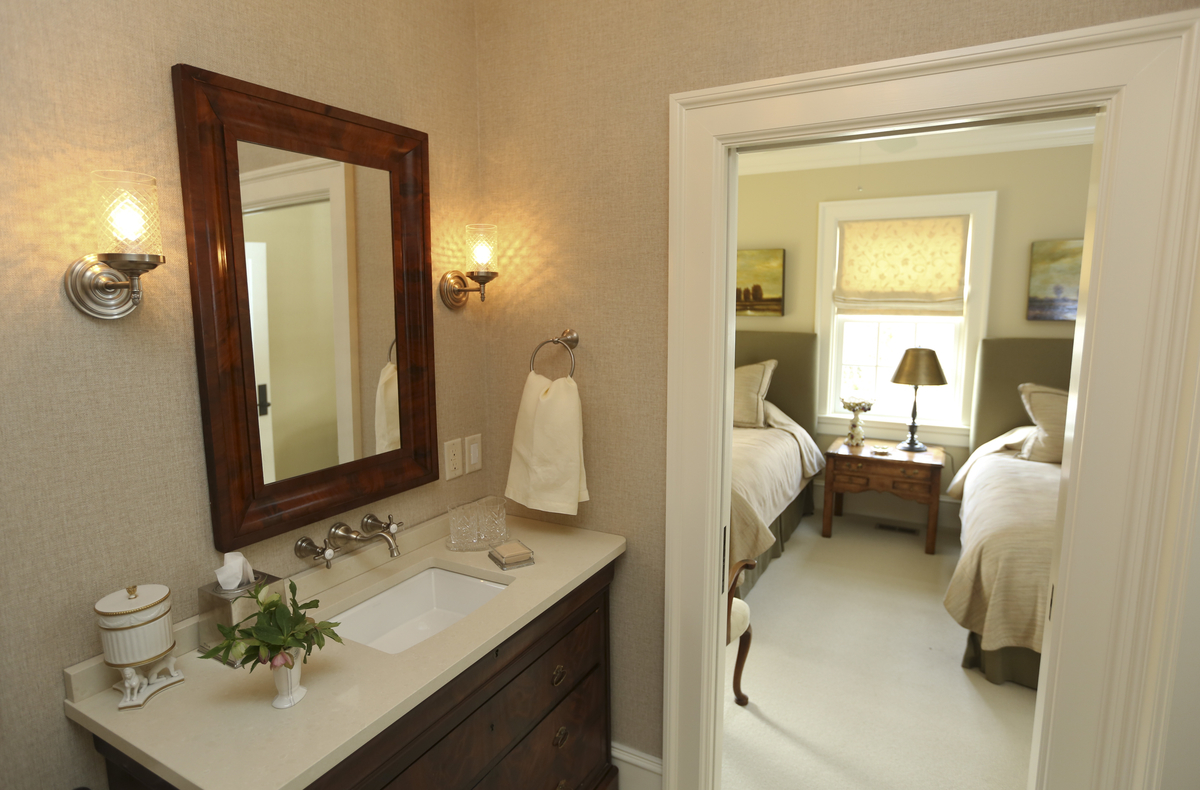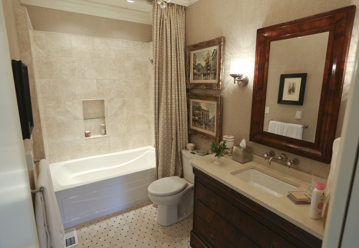 This smaller bathroom is both sophisticated and warm.